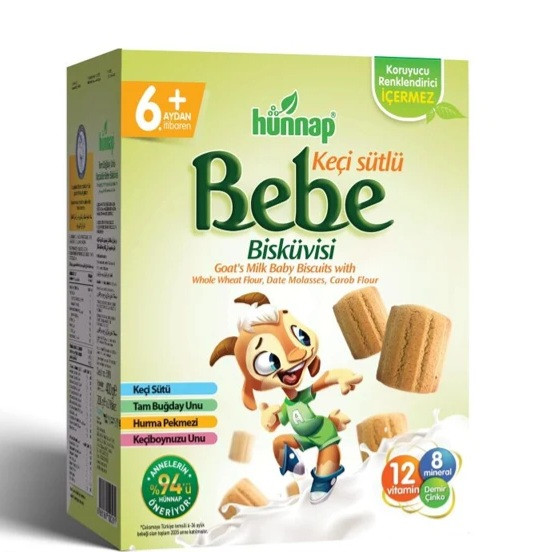 بیسکوئیت با شیز بز هوناپ این بیسکوئیت مخصوص کودکان دارای آلرژی به شیر گاو است. سرشار از آهن و کلسیم و روی میباشد. غنی شده با ع ویتامین و 8 نوع مواد معدنی شیرین شده با شیره خرما تهیه شده از شیر تازه بز و آرد کامل گندم و آرد کامل خرنوب ( این گیاه برای درمان سرفه و استفراغ استفاده میشود) یک میان وعده کامل برای کودکان میباشد. فاقد گلوکز و رنگ مصونوعی و مواد نگهدارنده مناسب کودکان بالای 6 ماه وزن 400 گرم