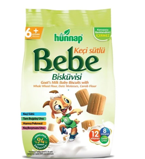 بیسکوئیت با شیز بز هوناپ این بیسکوئیت مخصوص کودکان دارای آلرژی به شیر گاو است. سرشار از آهن و کلسیم و روی میباشد. غنی شده با ع ویتامین و 8 نوع مواد معدنی شیرین شده با شیره خرما تهیه شده از شیر تازه بز و آرد کامل گندم و آرد کامل خرنوب ( این گیاه برای درمان سرفه و استفراغ استفاده میشود) یک میان وعده کامل برای کودکان میباشد. فاقد گلوکز و رنگ مصونوعی و مواد نگهدارنده مناسب کودکان بالای 6 ماه وزن 400 گرم