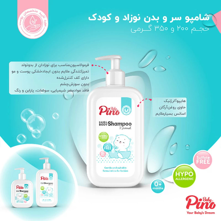 شامپو سر و بدن پینو بیبی Pino baby، تمیزکنندهی ملایم که از خشکی پوست و موی کودک جلوگیری میکند