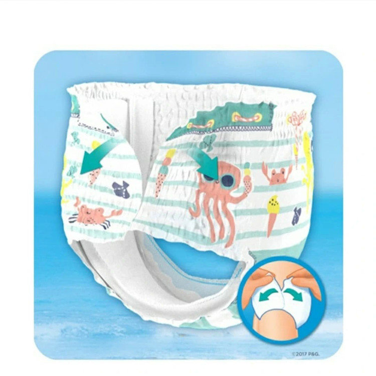 پوشک بچه استخری ( ضد آب ) پمپرز سایز 4-5 مناسب برای نوزادان با وزن 9 تا 15 کیلوگرم می باشد در بسته های 11 عددی به بفروش می رسد ، این پوشک به صورت شورتی می باشد از نفوذ آب به پوشک جلوگیری می کند ، و وقتی که کودک در پوشک ادرار کند از نشت آن به داخل آب جلوگیری می کند ،پوشک های ضد آب استخری به صورت یکبار مصرف بوده و از آنها به عنوان شورت آموزشی به دلیل شورتی بودن نیز استفاده می شود