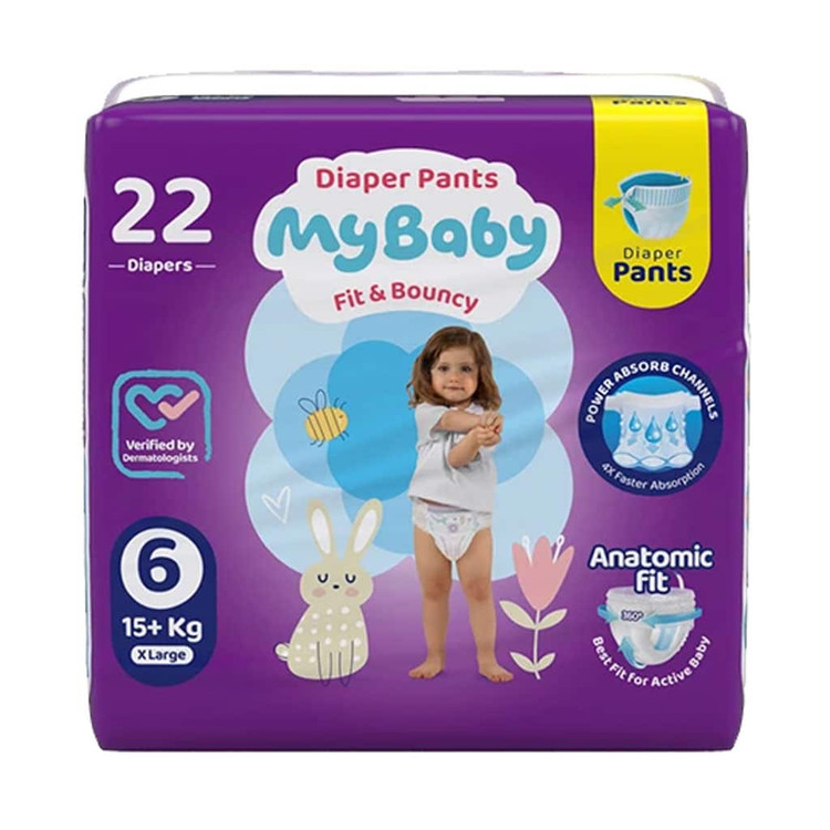 پوشک شورتی کانال دار مای بیبی سایز 6 برای کودکان بالای 15 کیلوگرم مناسب است و با قدرت جذب بالا، کش دور پای راحت و لایه رویی نرم و لطیف عمل تعویض را برای والدین آسان کرده است.